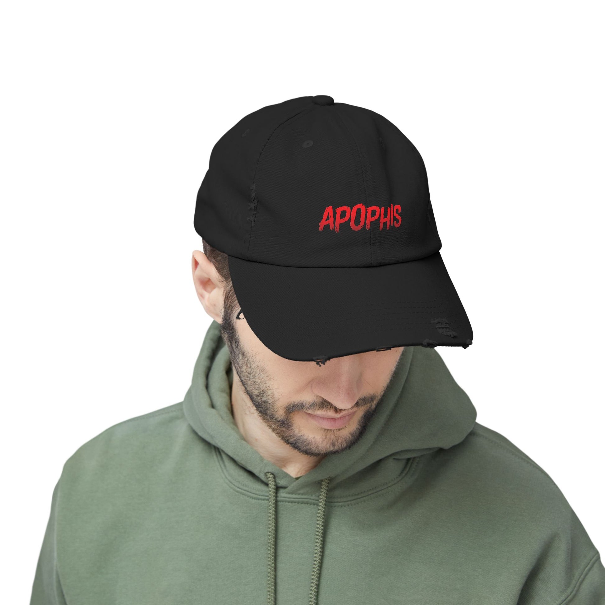 A lived-in, vintage-inspired cap embroidered with bold red lettering that reads "APOPHIS." The soft, unstructured 6-panel cotton twill drapes comfortably for everyday wear while the distressed edges and subtle fraying lend an authentic, rebellious edge. The low profile and curved visor fit into casual routines — morning coffee, late-night sets, or wandering city streets — while the discreet hideaway strap with metal D-ring keeps the silhouette clean. Each piece varies slightly in distress and tone, giving every hat its own character. Printed details use DTF for crisp color contrast against the black fabric.