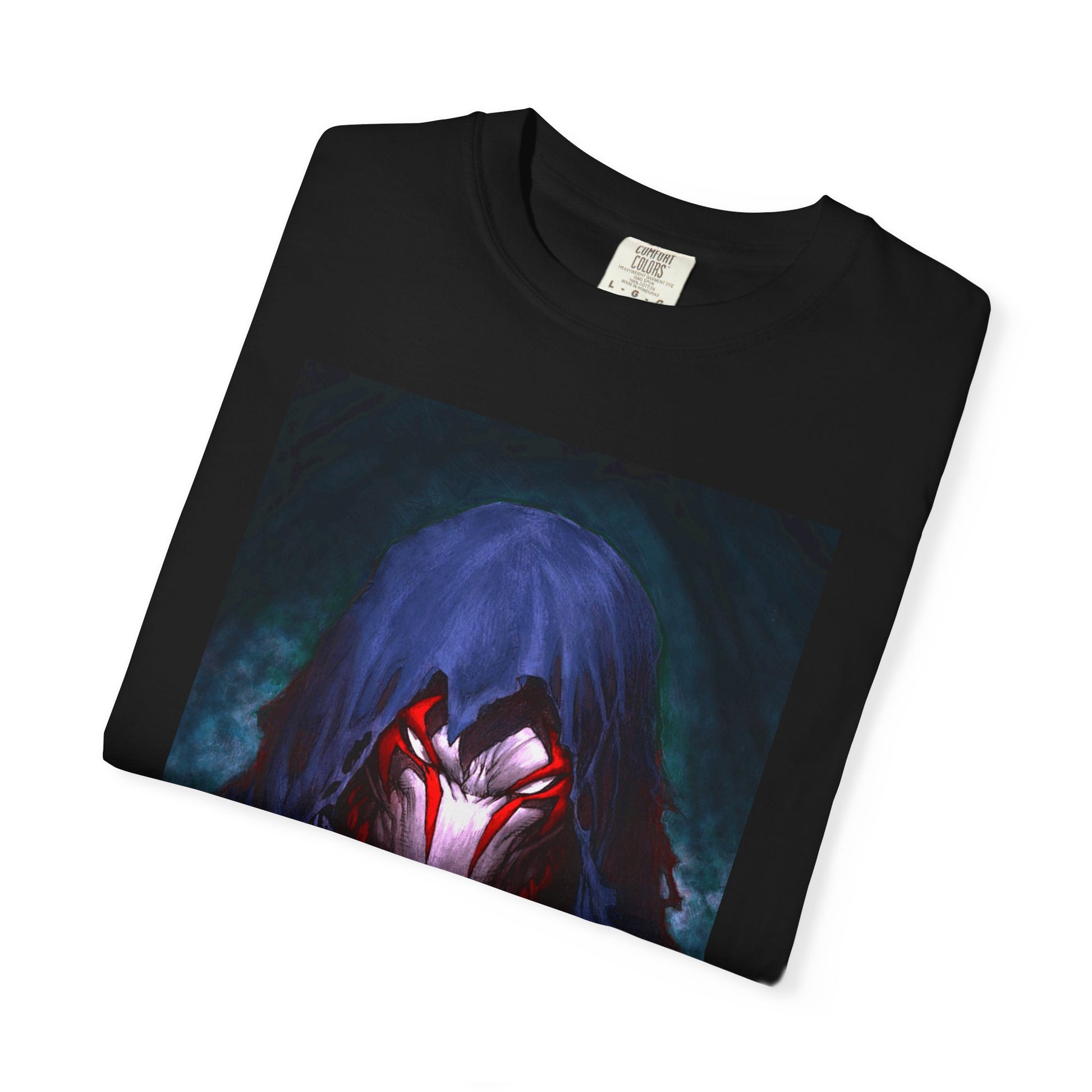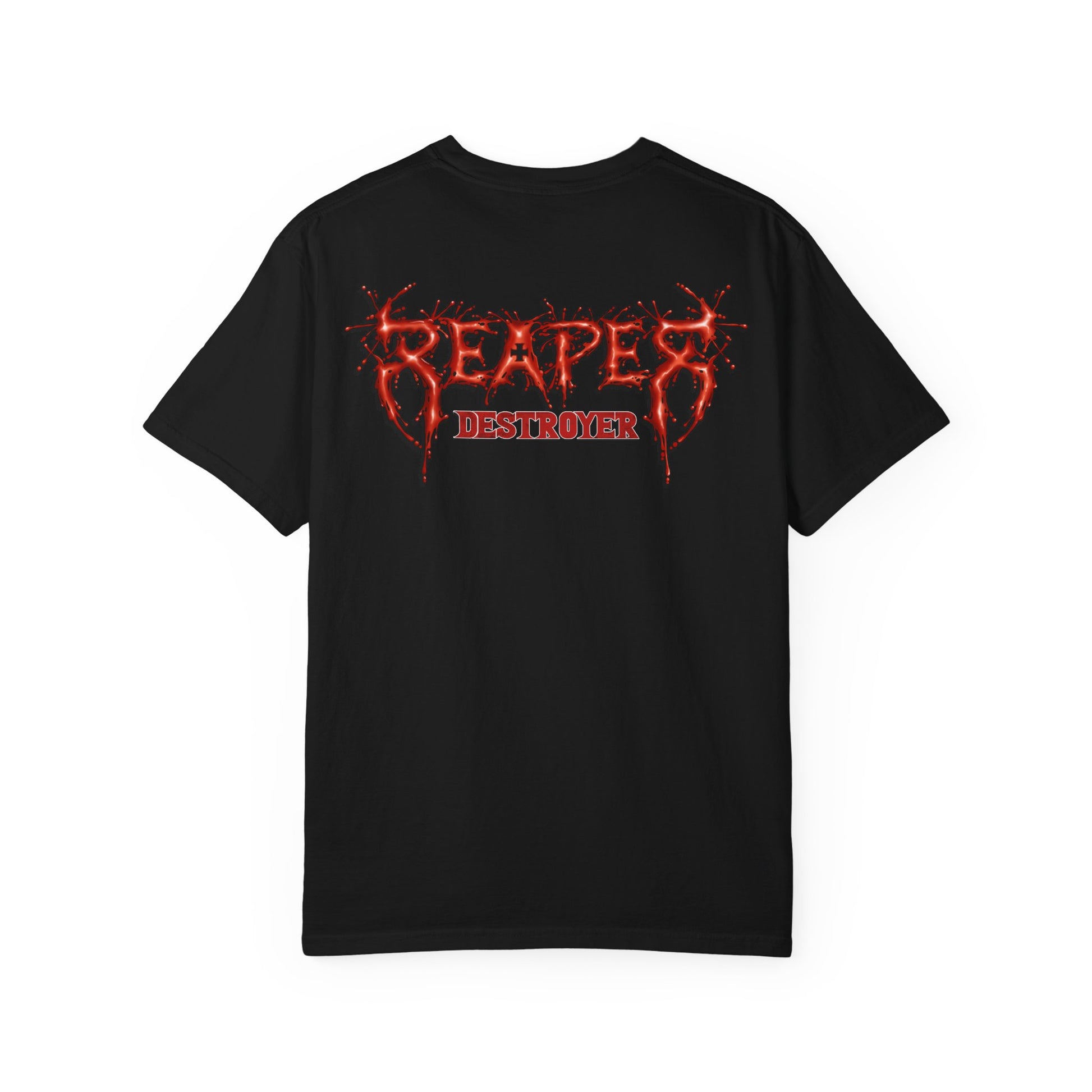 A dark, garment-dyed tee that channels late-night energy and heavy-hitting attitude. The front shows a hooded, spectral figure with a wicked, glowing grin; the back features jagged, blood-red lettering that reads “REAPER” with a distressed, molten texture and the word “DESTROYER” beneath. The medium-weight, ring-spun cotton feels broken-in from the first wear and the relaxed cut lets the artwork sit bold and unapologetic on your chest. Wear it to mosh, to game night, or around town when you want to carry a little menace—this shirt settles into your rotation like an old favorite and grows softer with every wash.