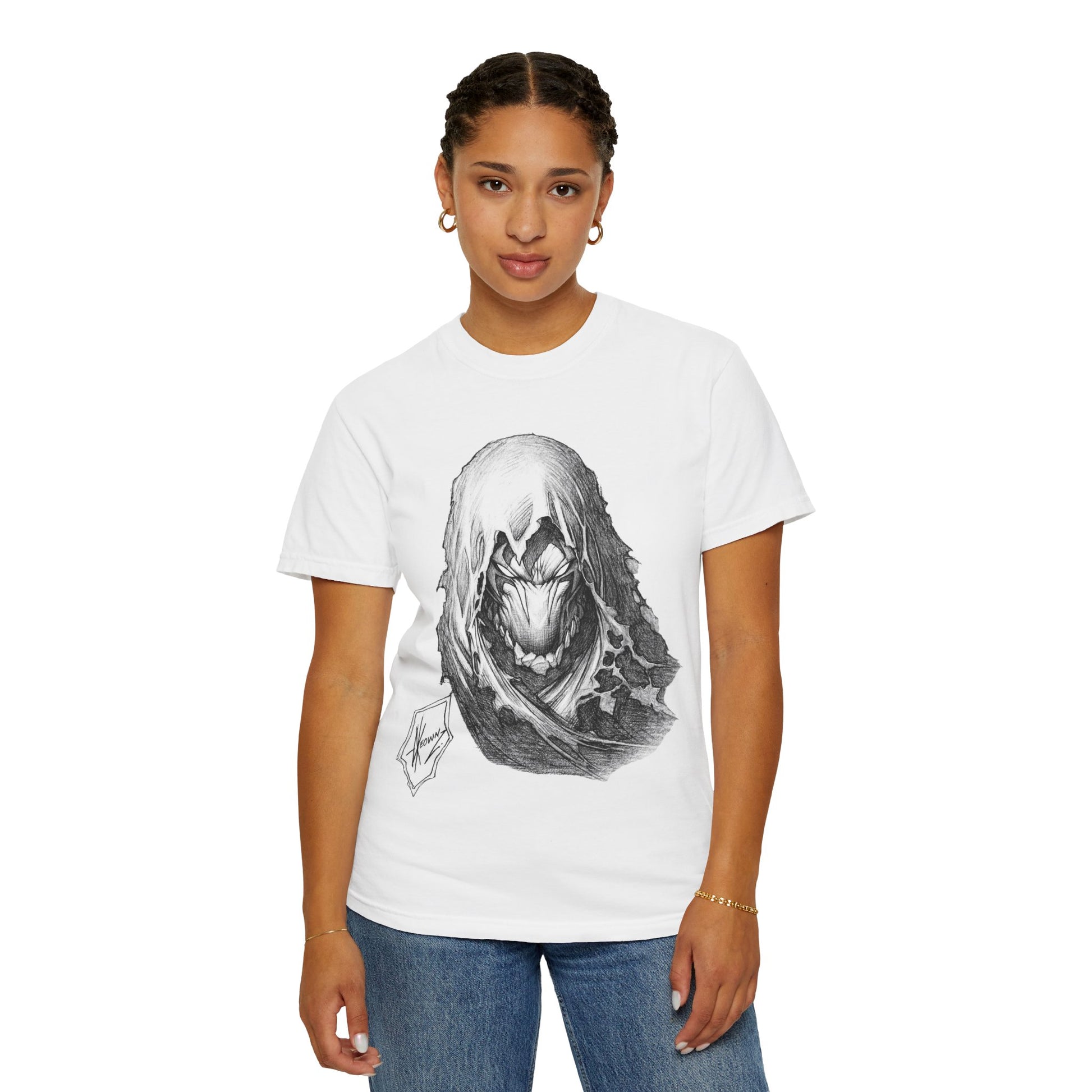 A washed, garment-dyed cotton tee that wears in like an old favorite while carrying a bold, dark-art aesthetic. The front shows a shadowed hooded figure rendered in detailed graphite tones — ambiguous, eerie, and strangely magnetic. On the back a hand-drawn, barbed-band logo reads “DESTROYER” beneath thorned lettering, giving the shirt a DIY metal-poster vibe. The relaxed cut and soft, pre-shrunk ring-spun cotton make it comfortable for long shows, late-night drives, or layering under a worn jacket. This is for people who collect mood over polish: those who like their wardrobe to feel lived-in and to tell a story without shouting. Available in a wide palette of garment-dyed shades and solid construction, it’s a tactile piece that darkens subtly with wear and becomes more personal with each wash.