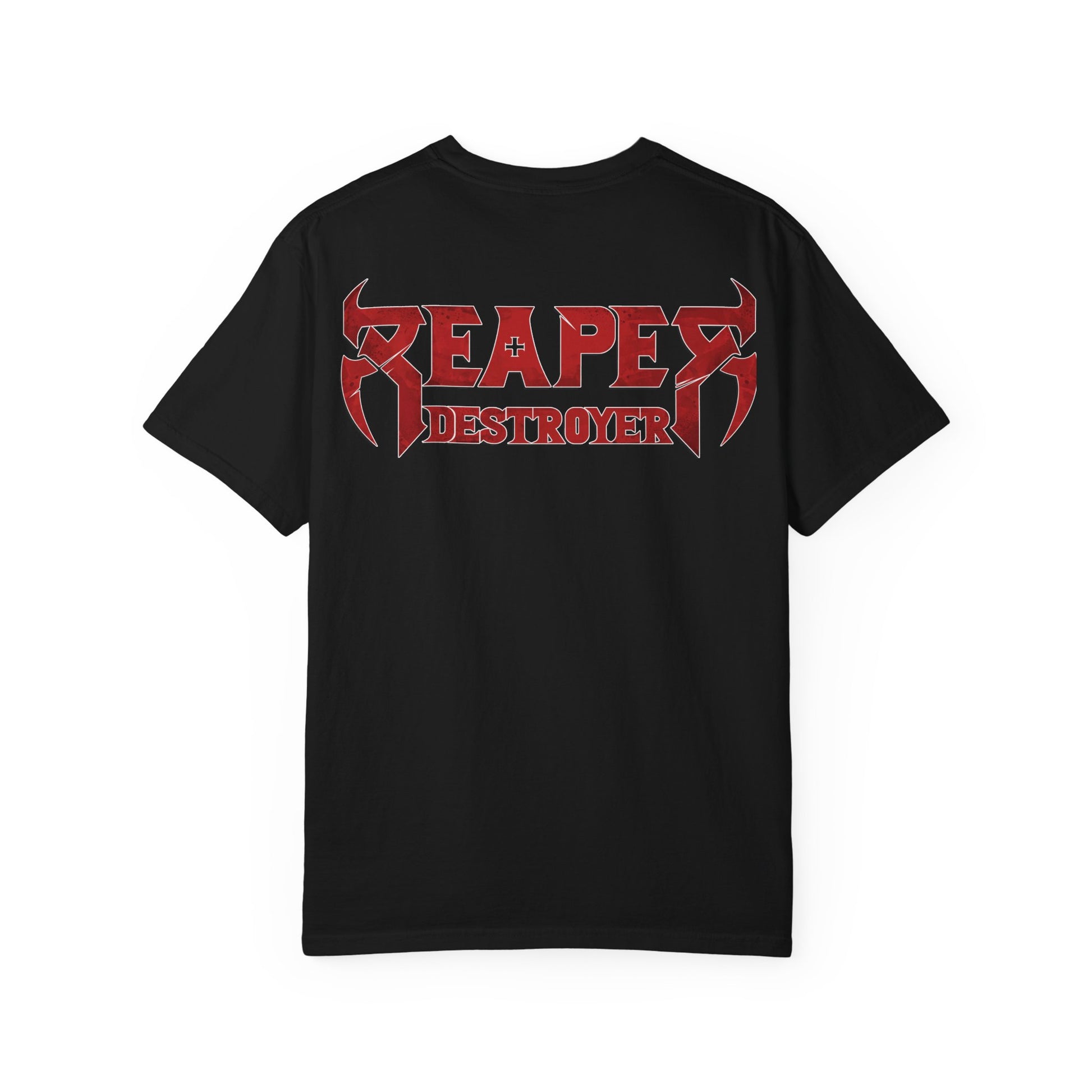 A heavyweight, garment-dyed tee printed with bold metal-inspired artwork — a snarling, armored figure leaping against a burning skyline on the front and a jagged “REAPER DESTROYER” logo across the back. The relaxed fit and soft, post-dye texture give this shirt a worn-in feel from day one. Wear it loud to shows, outdoor hangs, or when you want your style to match the soundtrack of a high-energy night. It sits right alongside tour shirts and band merch, but with the comfort and color depth of garment-dyed cotton.